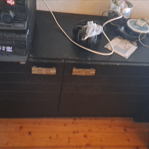 Snygg glashylla med flera plan och ben i metall. Passar bra för förvaring av Stereo utstyr