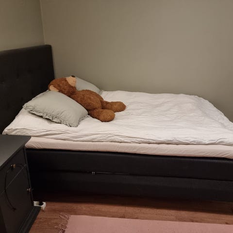 IKEA-säng 140 cm med blå klädsel och resårbotten, träben. 5000kr