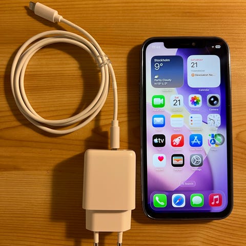 Apple iPhone XR med 64 GB lagring i svart. Har enkel bakre kamera och laddas med vanlig kabel och väggadapter.