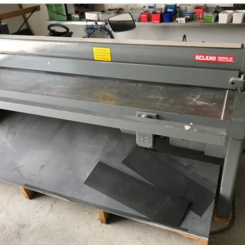 Den används för att klippa raka snitt i plåt. Man skjuter in plåtark mellan knivarna och klipper av dem till önskad bredd eller längd. Den här maskinen är betydligt snabbare och mer exakt än att klippa för hand eller med en nibbler.