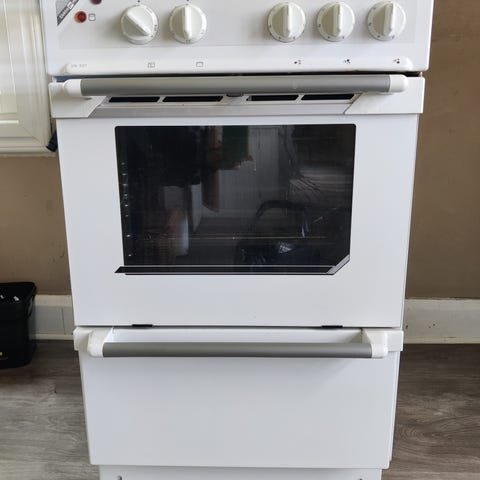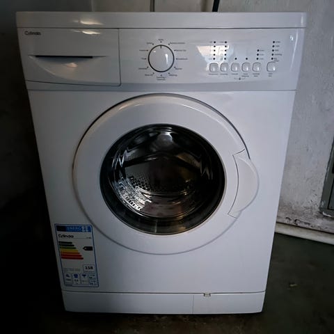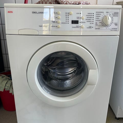Tvättmaskin och spis står i källaren. Dom är skitiga men funktionella.