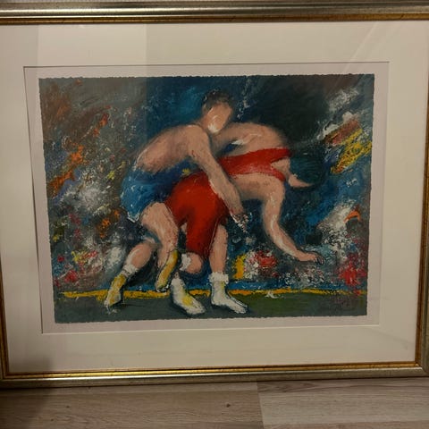 Färgstark litografi i ram, numrerad 26/99 nere i hörnet. Signerad av konstnären och sitter i en guldfärgad ram med passepartout.