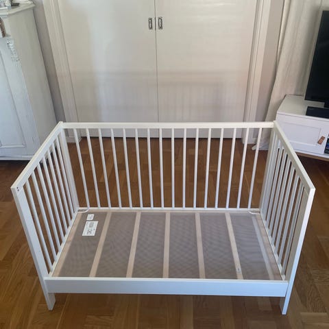 Våra barnbarn har blivit stora. Spjälsäng Sundvik 60x120 cm från IKEA är tidlös, materialen slitstarka och detaljerna gjorda med omsorg. Botten går dessutom att sänka bottnen och ta bort en långsida när barnet blivit större (som på bilden). Sängen säljs komplett med madrass, täcke, påslakan med örngott, samt spjälskydd. Nypris 2,731 :-
