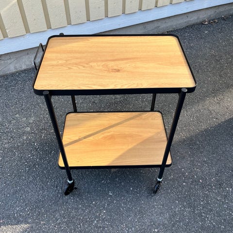 Säljer ett svart träbord på hjul.