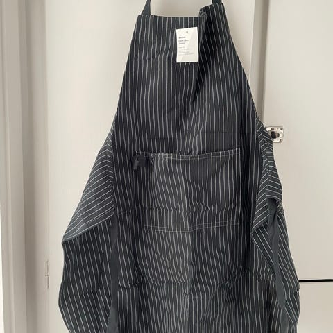 Enkelt förkläde i beige och brunt med stor ficka fram. Knyts i midjan och har nackband som går att justera efter längd.
