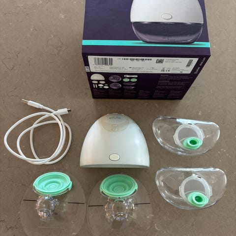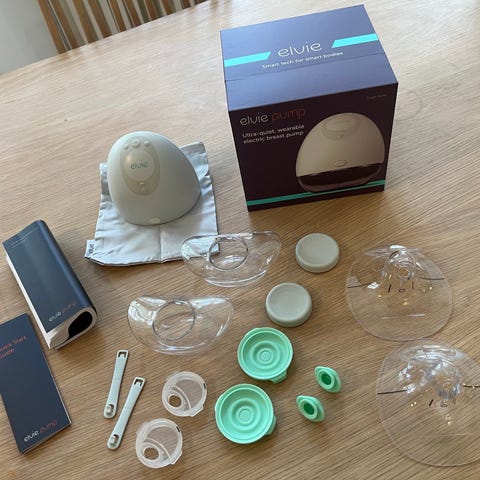 Elvie Pump dubbel elektrisk bröstpump i vitt med flera uppsamlingskoppar och ventiler. Laddningsbar pump med enkla knappar upptill och genomskinliga delar som sätts direkt i bh:n.