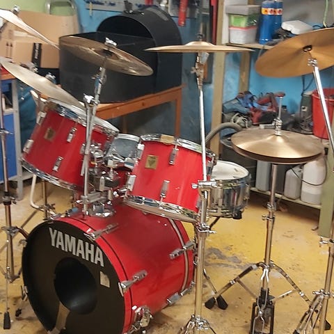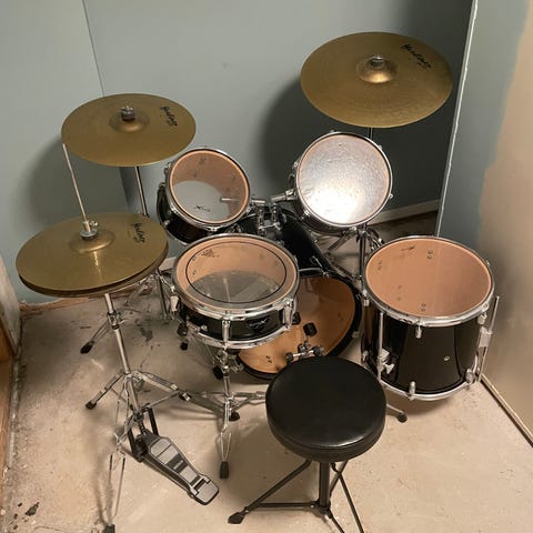 Pearl trumset i svart med bastrumma, pukor, virvel och cymbaler. Stabilt stativ och enkel pall ingår på bilderna, redo att ställas upp där du vill spela.