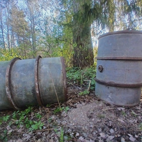 Två grå gasolflaskor i olika storlekar. Båda har skyddslock upptill och står stadigt på metallfot. P11 8,1 kilo gas kvar. P6 1,8 kilo gas kvar.