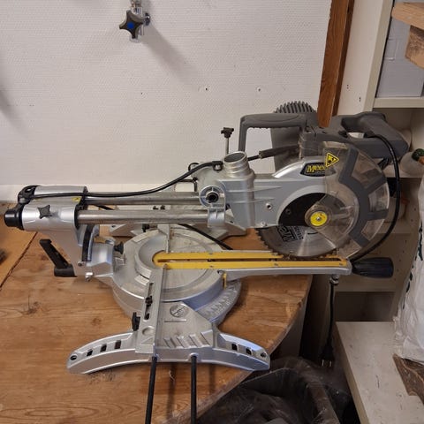 Festool Kapex KS 120 EB kap- och gersåg med tydliga reglage och skala för vinklar. Har sågklinga monterad och flera handtag som gör den lätt att ställa in. Ring Benke 0706706390