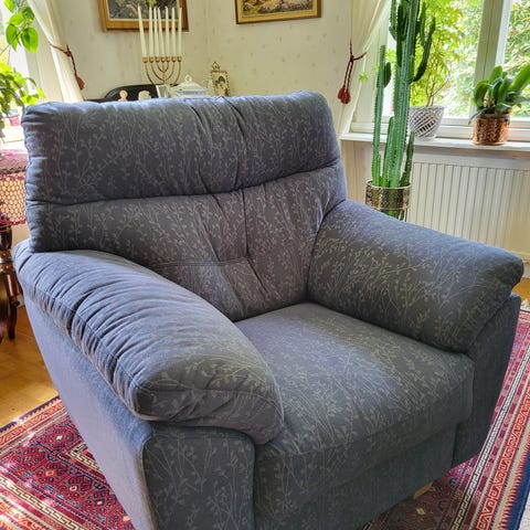 Blå fåtölj och soffa från Mio med mjuk klädsel. Ryggkuddarna har mönstrat tyg och breda armstöd som gör dem sköna att sitta i.