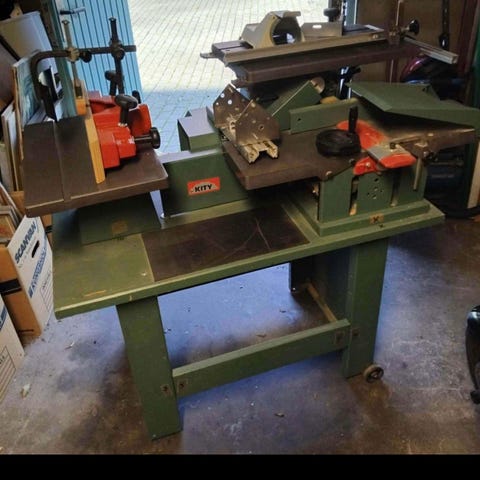 Maskinen är en äldre men stabil verkstadsmaskin som passar bra för enklare slipjobb i trä, metall och plast. Kombinationen gör den smidig för både plana ytor och rundare detaljer.