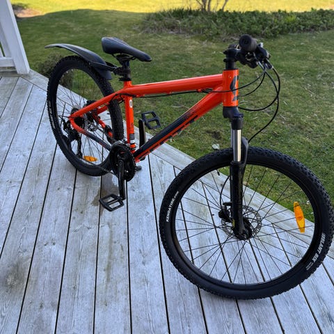 cykel för den som vill kunna cykla till skolan samt i skogen, 24 växlar med skivbromsar och ett starkt lås.