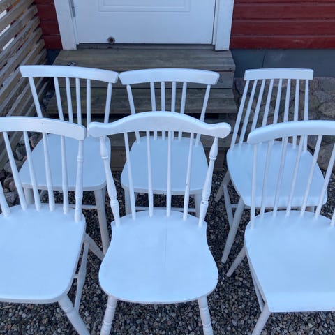 Normalt slitage och fläckar på sitsarna (se bilder), men fullt fungerande. Lätta att byta klädsel och måla