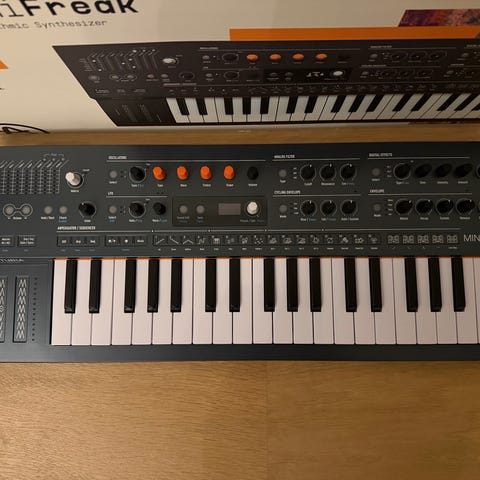 Modal Cobalt8 synthesizer med klaviatur och många reglar för ljudformning. Flera in- och utgångar på baksidan för MIDI och audio, allt snyggt förpackat i originalkartong.