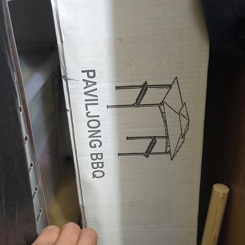 Grått hängparasol från brafab Stor modell med fristående fot, enligt kartongen 267 x 32,5 x 18 cm förpackningsmått.