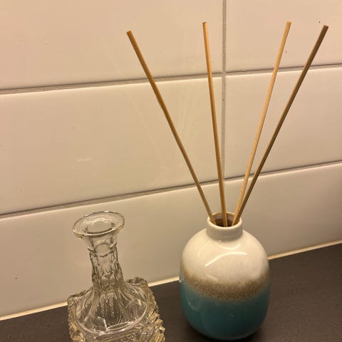 Fint dekorativt kärl med doftolja och pinnar, 10 cm höjd, från det danska märket Villa Collection, doft Pure Happiness almond orange neroli