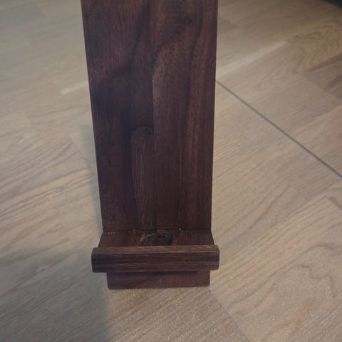 Enkelt träställ i mörkbrunt trä med lutande stöd och urfräst hål framtill. Passar bra att ställa mobil eller surfplatta på ett bord eller skrivbord.