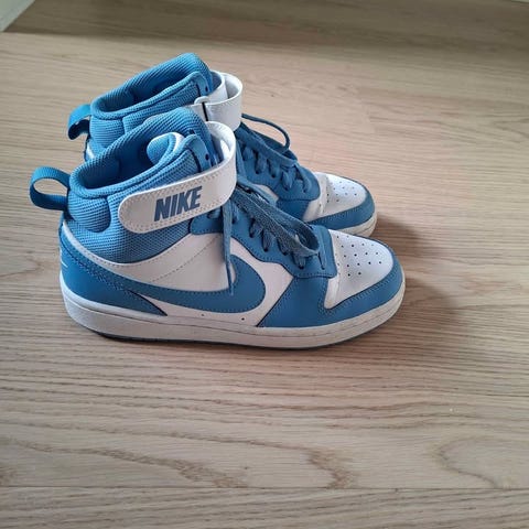 Blå Nike sneakers i stl 25 med gula detaljer och vit sula. Kardborreband och snörning framtill som gör dem enkla att ta på och av.