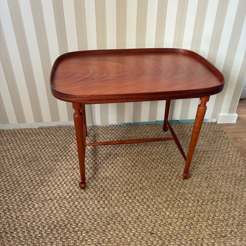 Soffbord från Svenskt Tenn formgivet av Josef Frank med fin träådring i skivan. Har mjukt rundade hörn och svängda ben med små fötter.
