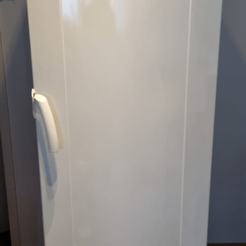 Jag köpte frysen till min mor 2024-11-11 för 9146 kr (se kvittering). I oktober 2025 flyttade hon hemifrån, därefter har frysen stått oanvänd. Den är i mycket gott skick. Men: När frysen skulle transporteras från Värmland till mitt förråd så lyckades dessvärre flytthjälpen orsaka ett par mindre tryckmärken (från pirran?) på höger sida, och ett par repor på dörren (se bilder). Så himla typiskt :)