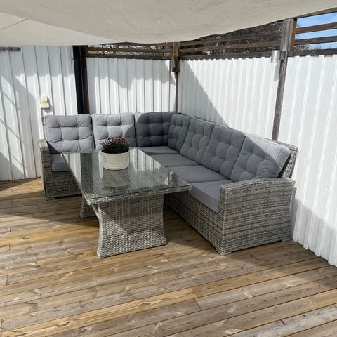 Stor utemöbelgrupp i grå konstrotting med hörnsoffa, bord med glasskiva och matchande dynor. Flera delar har praktisk förvaring under sitsarna för kuddar och annat smått.