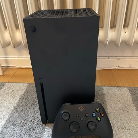 Xbox Series X spelkonsol i svart. Två trådlösa handkontroller och en kabel syns på bilden.