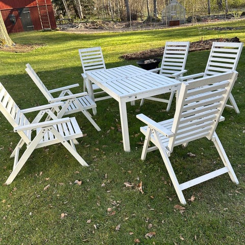 Grythyttan, trädgårdsgrupp med runt bord och 7 stolar. (4 av en sort och 3 av en) Vissa brädor behöver bytas och målas om.