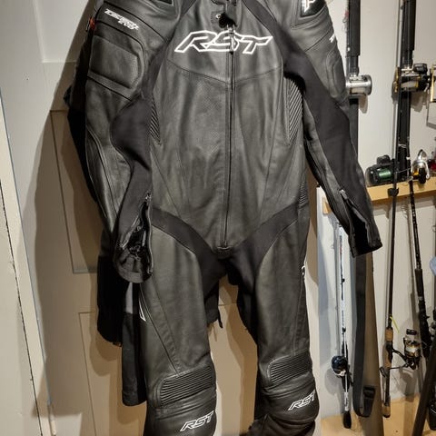 MC-Skinnställ från 4Bikers i storlek 3XL. Passar passar längd ca 185cm och längre, ca 85-100kg vikt. Handskarna på bilden ingår ej. 1500kr.
