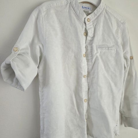 Vit skjorta från Toysi i stl 104 för pojke, med mörka knappar och bröstficka. Har mönstrat tyg på insidan av kragen och knapp för att vika upp ärmarna.