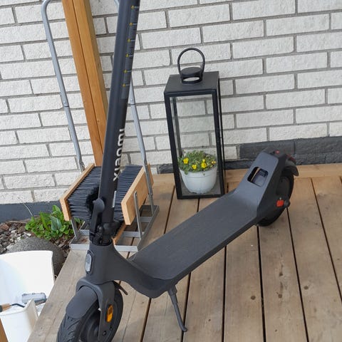 Xiaomi elsparkcykel i svart med ståplatta med mönstrat grepp. Har handbroms, stöd och bakre stänkskärm med reflex.