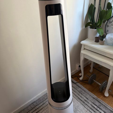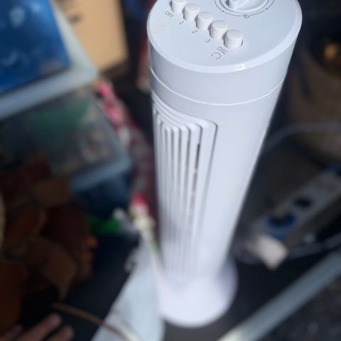 Svart tornfläkt med rund fot och smal hög design. Har ventilationsgaller längs framsidan och bärhandtag upptill.