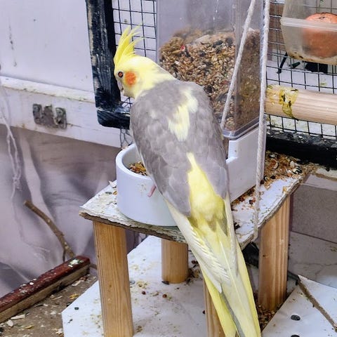 Det har blivit förmånga Nymfer . Den är inte helt tam . Är bara 8 veckor gamal. Det går att klia den i nacken och på bröstet. Flyger fitt på dagen och sätter sig i buren när det är kväll. Som ni förstår vet jag inte om det är hane eller hona, (De bör vara ett år minst innan man ser skillnade säkert)