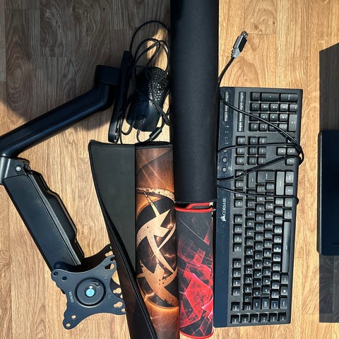 Logitech trådlös gamingmus och trådlöst tangentbord från cep1er.,Ingår även trådlöst HyperX-headset och en skärmlampa som fästs ovanpå skärmen, någon billig webcam från power
