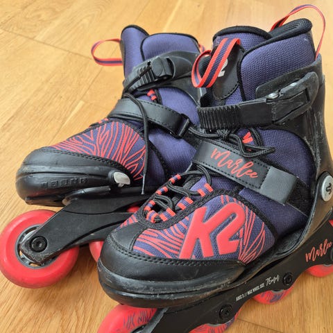 Roces Jokey 3.0 inlines för barn i stl 34–37, svart med rosa detaljer och mönster. Justerbara med spänne och kardborre samt hårt skal som ger bra stöd runt foten.