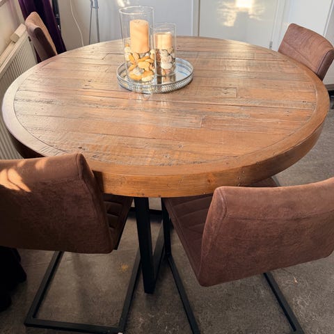 Säljer vårt fina runda matbord från Trademax, modell Bloomington Lyon, 150 cm i diameter. Bordsskivan är tillverkad av återvunnet trä som uppges vara cirka 200 år gammalt, vilket ger bordet en unik karaktär med naturliga ådringar, struktur och rustik känsla.