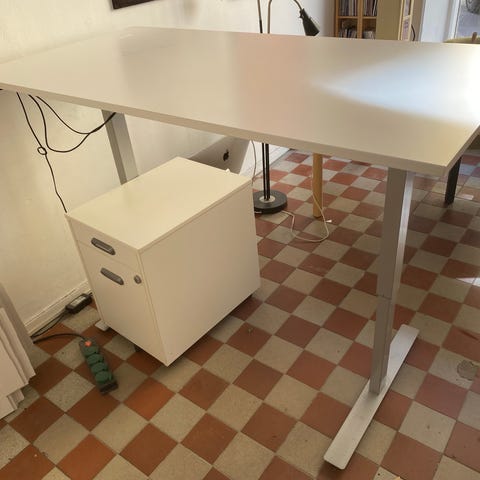Stadigt höj och sänkbart skrivbord i ljus träfärg med rundade hörn. Gott om plats för skärm, tangentbord och annat på bordsskivan.