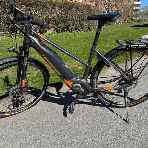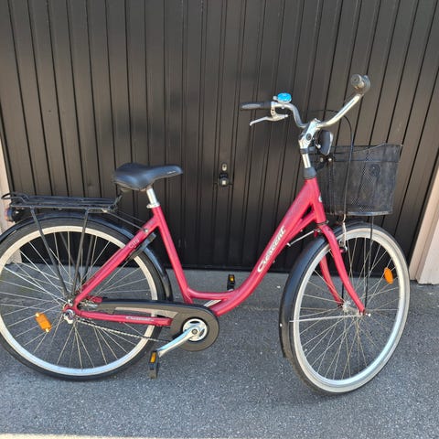 Trevlig elcykel inköpt 2017. Biltemas egna märke Yosemite för dam med 28" hjul i turkos färg. Utrustad med korg fram, pakethållare bak och lågt insteg.