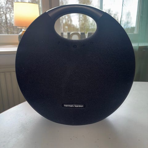 Harman Kardon rund trådlös högtalare i svart tyg med liten logga på framsidan. Står på två små fötter bak som gör att den lutar lite bakåt.