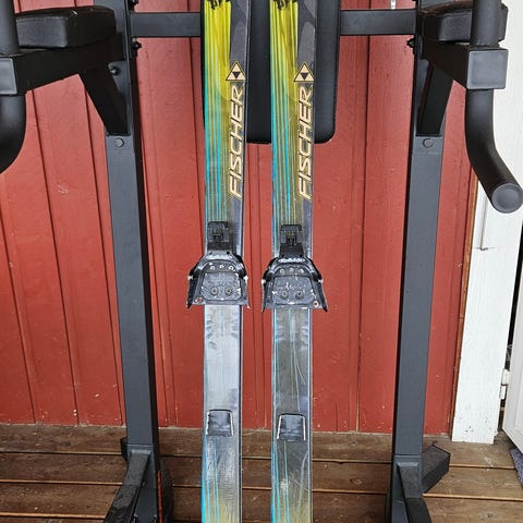 Telemarkskidor med Rottefella Carve bindningar och färggrafik på ovansidan. Stålkanter och kabelbindningar med fjädrar, redo att ställas in efter dina pjäxor.