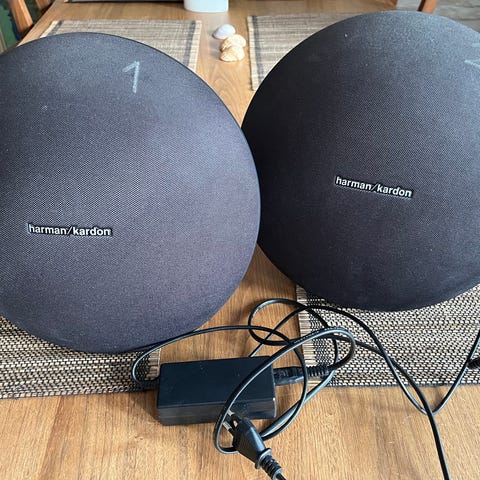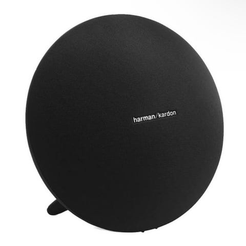 Harman Kardon bärbar högtalare i svart med inbyggt handtag upptill. Har knappar på ovansidan och gummifot undertill som gör att den står stadigt på bordet.