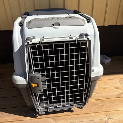 Rymlig transportbur i plast för hund, vit ovandel och svart botten. Gallerdörr fram och ventilationshål på sidorna, samt enkel insida som är lätt att hålla ren. Den är lite gammal men vi har inte använt det mycket, mesta för flera flytt var vi behövde skicka hunden i flygplan med den. Vår hund är 18kg så det skulle passa bra för en hund i denna storlek. Man kan ta isär den och det har vi gjort. Skruvarna för att montera kommer självklart med. Jag vet inte hur man fastnar på plastgrej för vatten men plastgrej för mat är lätt att fastna på.
