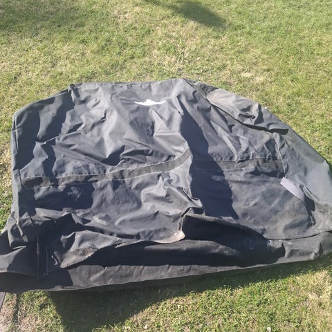 Grått bilöverdrag med dragsko upptill och märkt med lapp T33-2AE. Tyg i nätliknande material som släpper igenom lite luft.
