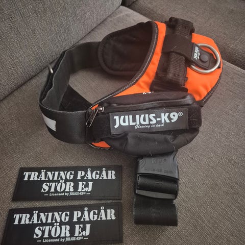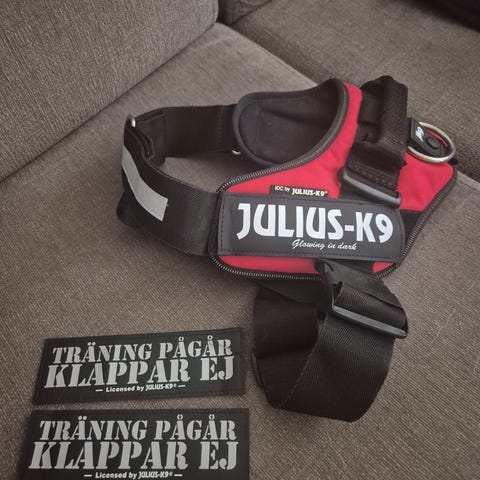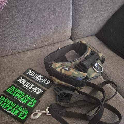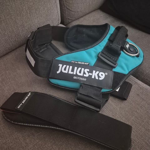 Säljer en ny k9 sele I storlek L passar hundar upp till 30kg säljes för 700kr ny pris på bara selen är 919kr nypris på tillbehören är 200kr styck och märkena är nypris 100kr selen är köpt på widforss.se färgen är petrol som tredje bilden ska den skickas tillkommer frakt
