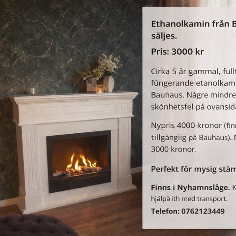 Vit öppen spis Cambridge från Rusta för biobränsle/etanol med svart insats och tre brännare. Fristående modell med klassisk ram som ställs direkt mot väggen på golvet.