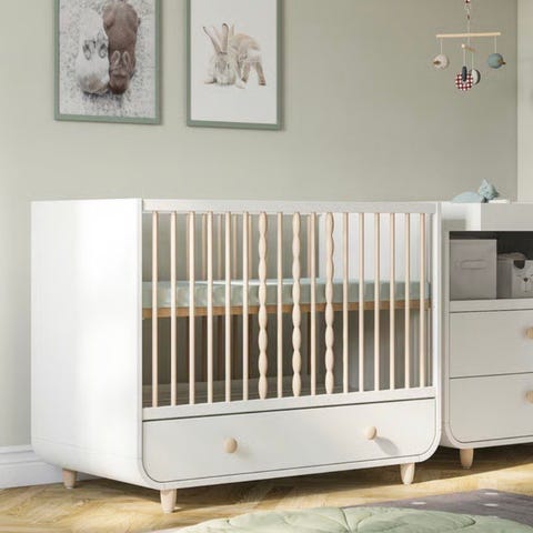 Vit spjälsäng från IKEA med klassiska spjälor runt om.