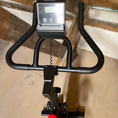 Spinningcykel i svart och rött med rejält svänghjul och justerbart styre och sadel. Har enkel träningsdator, flaskhållare och pedaler med rem.