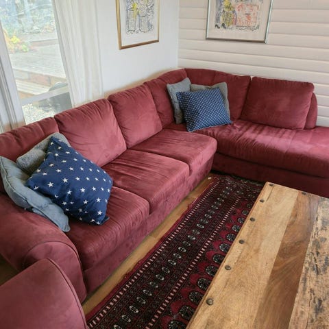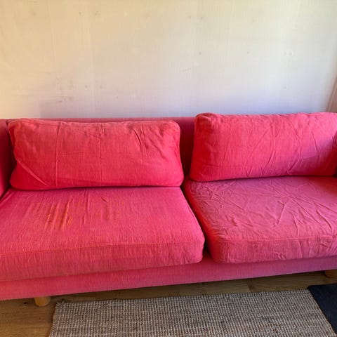 Soffan är i använd skick med inga synliga skador eller fläckar. Står i ett djur och rökfritt hem. Schäslongen går lätt att skifta mellan höger och vänster sida. Det finns en till kudde till ryggstödet men jag har valt att inte använda den.