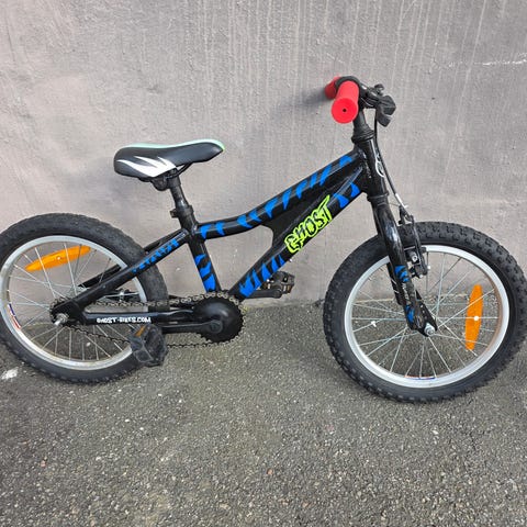 Barncykel 16 tum, passande 3-5 åring. Den är i bra skick, fina däck, handbroms och fotbroms. Sadeln har några små-hål och handtagen har sett bättre dagar.