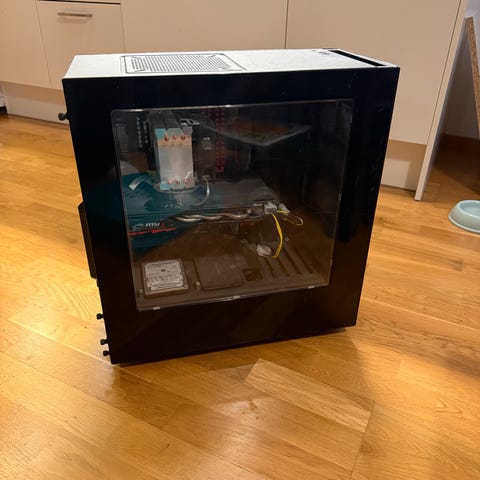 MSI stationär dator med svart chassi. Datorn är byggd i ett tornchassi med sidopanel i glas och ventilationsgaller upptill och baktill. Baksidan har flera anslutningar för bildskärm, USB och ljud samt expansionsplatser för extra kort. Passar som stationär hemdator eller spel-/arbetsdator beroende på intern hårdvara som inte framgår av bilderna