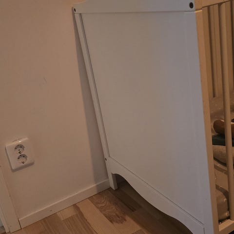 Vit spjälsäng från IKEA med madrass. Ena sidan har en avtagbar sänggrind som gör det enklare att komma åt barnet.